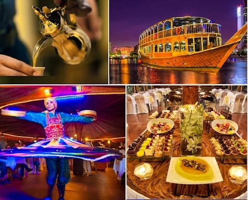 Glide along Dubai Creek, passing iconic landmarks like the Gold Souq, Dubai Creek Harbour, and other heritage sites that showcase the rich history of Old Dubai. As you cruise, enjoy an exquisite international cuisine buffet, carefully crafted to satisfy every palate. The evening comes to life with a captivating Tanoura Light Dance show, adding a magical touch to your dining experience. Don’t miss this unforgettable journey through Dubai’s past, enhanced by delicious food and entertainment. Book your Dubai Creek Cruise now!