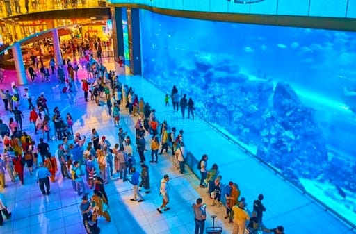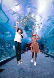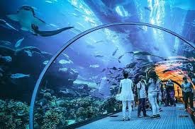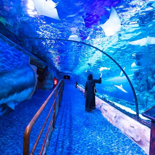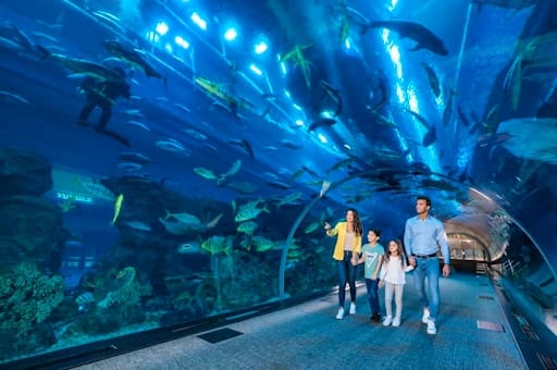Dubai Aquarium & Underwater Zoo + Penguin Cove offers visitors an immersive experience inside The Dubai Mall, featuring a large underwater tunnel and a variety of aquatic life, including penguins.